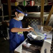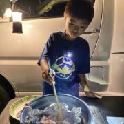→夕暮れになると、キャンピングカーの外には夥しい量の羽虫が、、、、車外での調理はあきらめて、車内で換気扇全開で焼肉。とくに問題はなし。