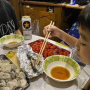 夜は宮古港”なあど”で購入した牡蠣で牡蠣鍋を堪能、さっき釣ったサバも焼いて食べる。美味いぞ。
