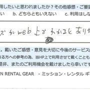 【アウトドア用品レンタル】 東京都 B.Y様 (男性) 2012/04/16 アウトドア用品ご利用者様の声2012年 〔ご利用者様より〕 重さやサイズがweb上でわかるとありがたいです。 〔 当店スタッフより 〕 ワンタッチタープ等をご利用戴きました。 ご利用誠に有 ...続きを読む