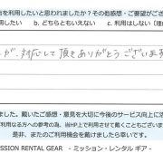 〔ご利用者様より〕 アンケート用紙の提出が遅くなってしまい申し訳ありませんでした。 スムーズな対応どうも有難うございました。 お陰様でキャンプを初めて ...続きを読む