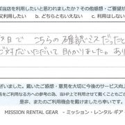 〔ご利用者様より〕 予約~納品~返却まで わかりやすく、利用しやすいシステムです。 ですが…テントが入ってなかったのは…。 ご返金等で対応願います。 ...続きを読む